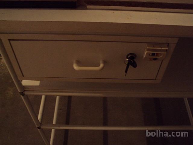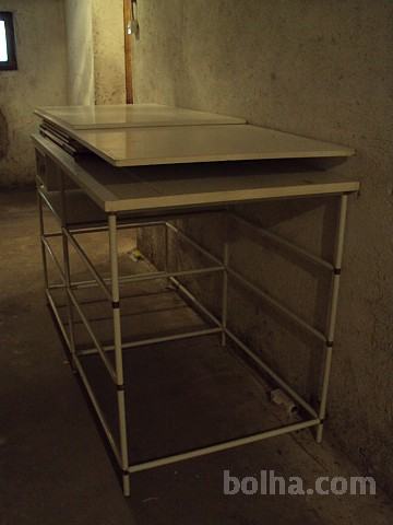 Delovna miza/pult - V.Š.D. 93 - 75 - 165cm, miza ima tri police, katere lahko odstranite in imate prostor za odlaganje večjih-višjih predmetov, prav tako je predal z ključem. Miza je dovolj visoka za krojaško delavnico, za pult ali za mizarsko delavnico in na splošno več namenska in trpežna miza. (spodnjo polico nisem uspela postavit zaradi shranjene rolete)