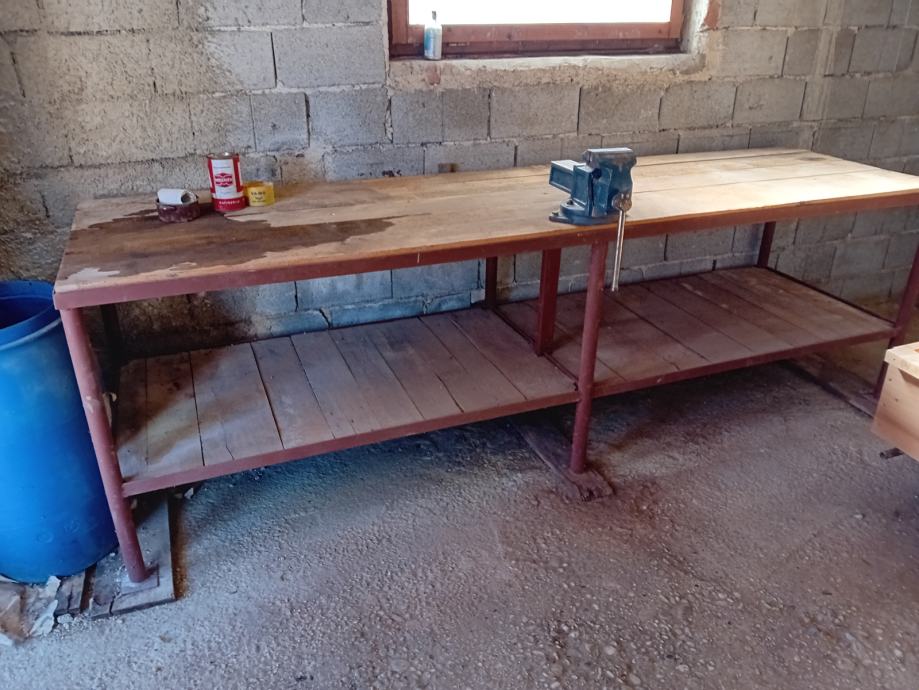 Prodam zelo močan kovinski delovni ponk s primežem, dimenzije: dolžina 300cm, širina 85cm in višina 90cm.