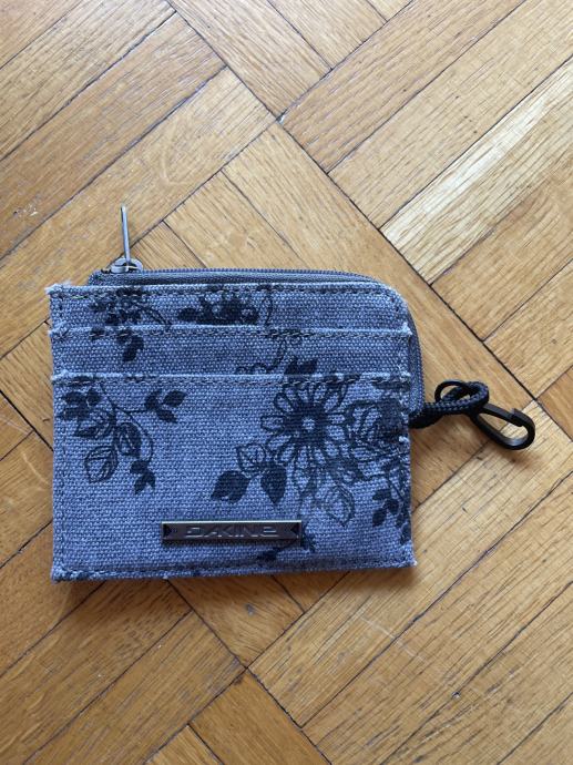 Prodam nikoli uporabljeno Dakine denarnico sive barve s črnim potiskom rožic. Denarnica ima predal za kovance in 3 prostore za kartice. Notranji žep za kovance je na zadrgo in ima vrvico za ključe.