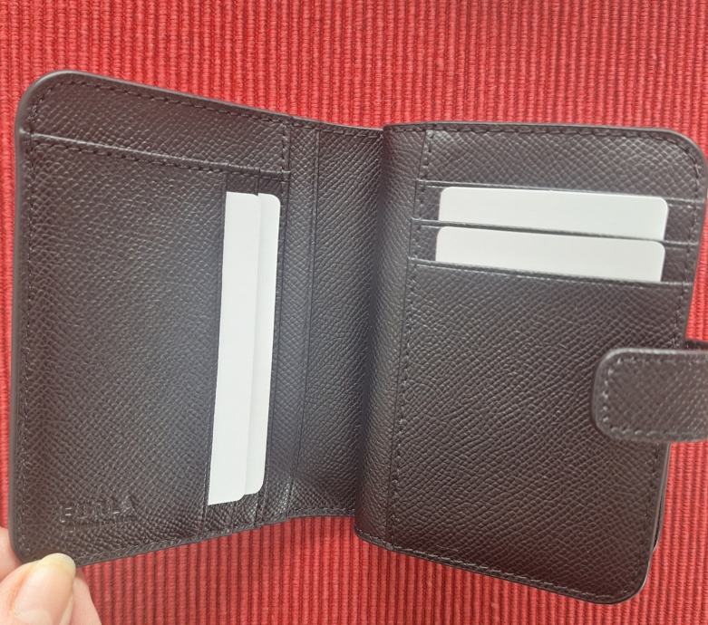 Prodam novo, usnjeno denarnico priznane znamke Furla. Denarnica ima certifikat, etiketo, zaščitno vrečko in lepo škatlo, zato je primerna tudi za darilo. Je prostorna - ima predal za bankovce, predal za drobiž, ki se zapira na zadrgo ter veliko predalov za kartice. Mera 12cm x 9cm.