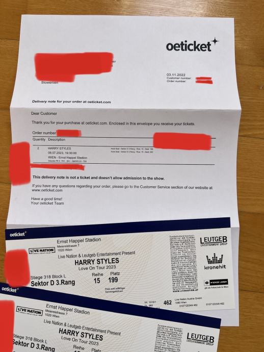 Prodam 2 karti za Harry Styles koncert na Dunaju. Karti imata vključeno zavarovanje, če se koncert odpove.