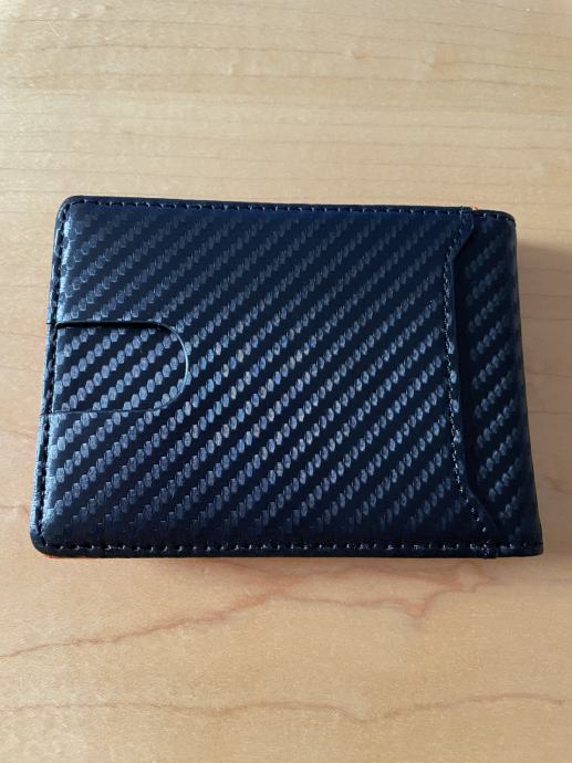 MOŠKA DENARNICA, NOVA, črna, znotraj oranžna, carbon, za več kartic, sponka za bankovce. Mere: 11 cm x 8 cm. Občasno možen prevzem na relaciji Zreče-Ljubljana. Tel.: 070 794 698.
