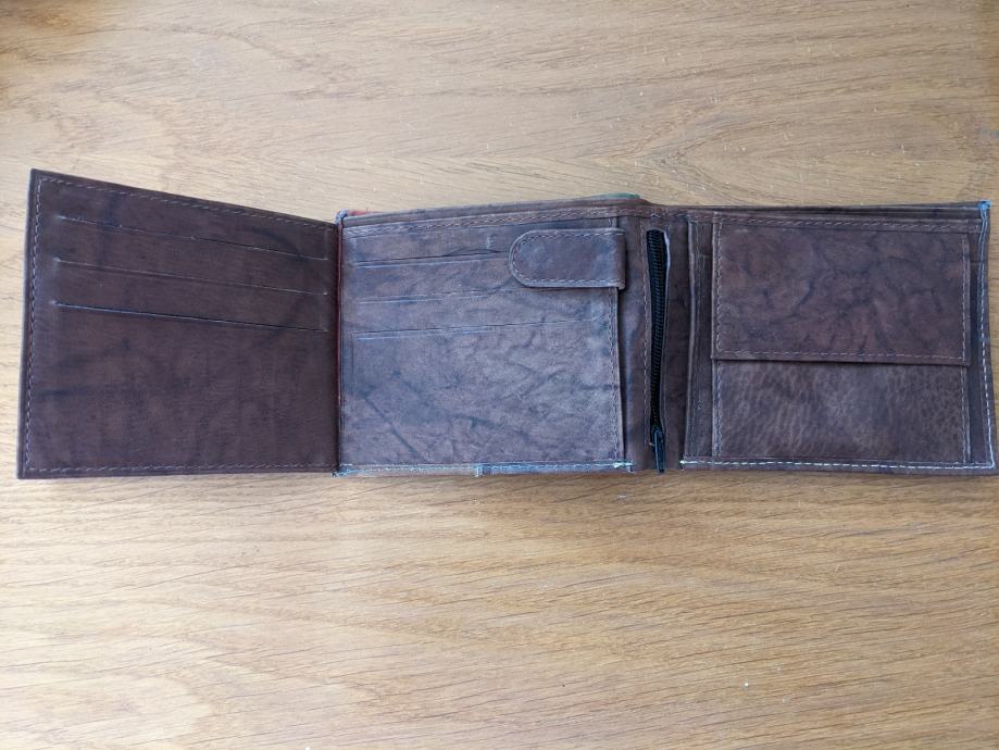 Prodajam skoraj nerabljeno moško usnjeno denarnico velikosti 12x10cm z unikatnim večbarvnim vzorcem. Denarnica je izdelana iz kakovostnega usnja in ima več praktičnih predalov za kartice in gotovino.