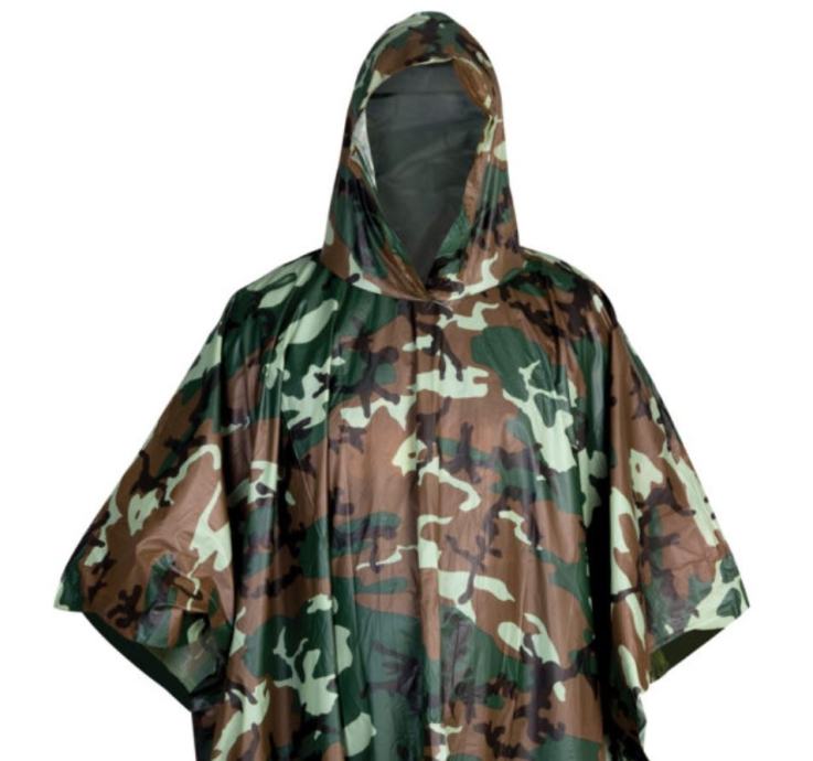 Pelerina z vojaškim vzorcem za deževne dni, primerna za hojo, delo ter ostale opravke na dežju ter v gozdu.Material: PVCVelikost: 127 cmKroj kenguru, dolžina do kolenKapuca, zalepljeni šivi