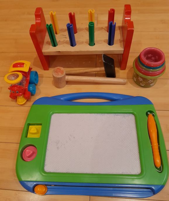 Prodam v kompletu: 3-delni set didaktičnih - ustvarjalnih igrač za vašega malčka. Gratis prejmete vlakec s ropotuljico!