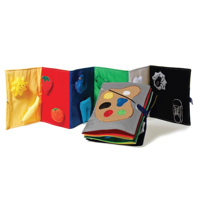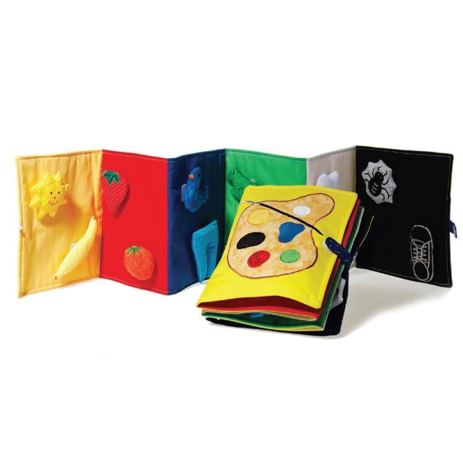 Učenje barv z mehko barvno knjigo je zabavno. Aktivnostna mehka knjiga malčkom pomaga osvojiti barve in besede s pomočjo 12 različnih predmetov, ki jih lahko odstrani in prilepi na podlago iste barve.