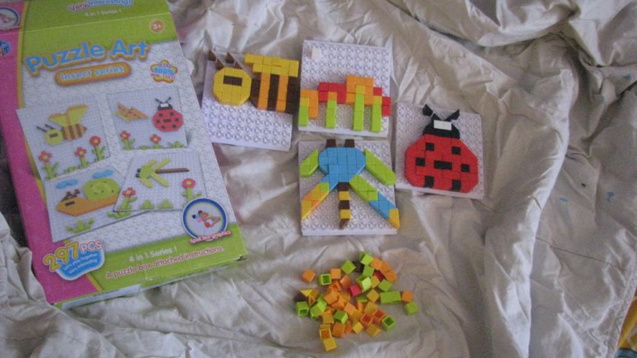 4 podlage+ barvne kockice, ki se dobro oprimejo podlage. Sestavi se lahko razlicne motive. Primerno od 3.leta dalje za krepitev ročnih spretnosti in domisljije. cena 10ev