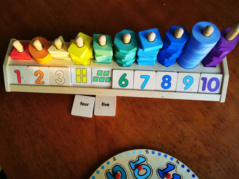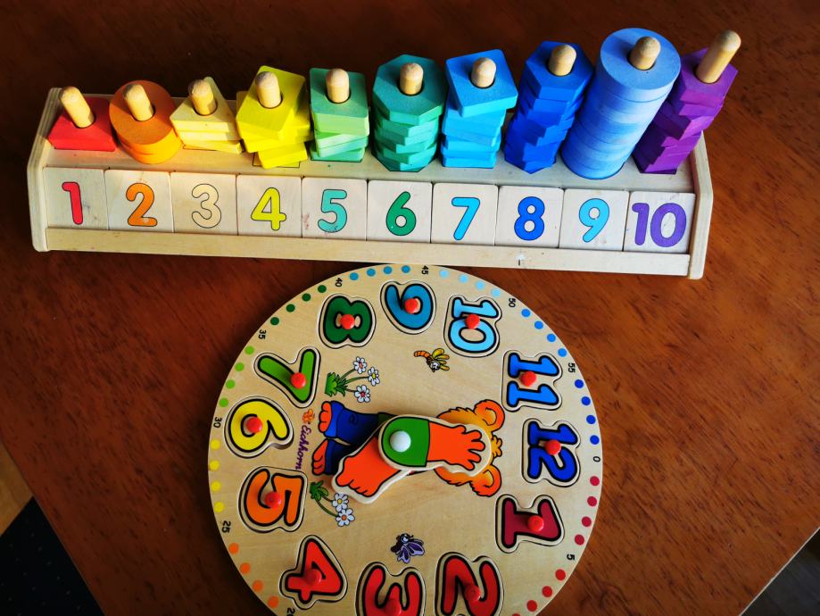 Prodam didaktični leseni igrači. Za štetje, prepoznavanje oblik, barv in učenje poznavanja ure.