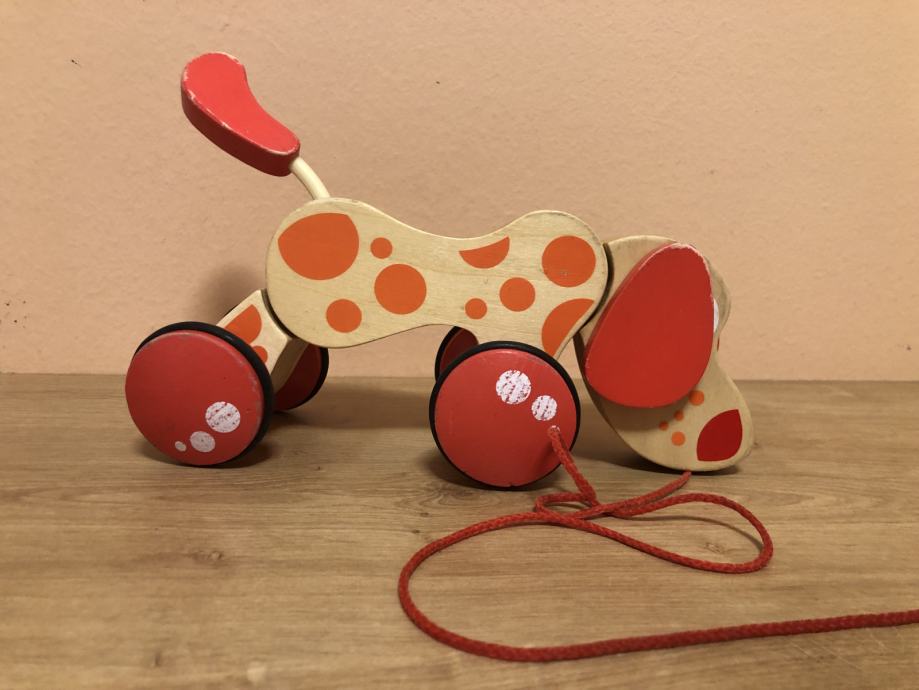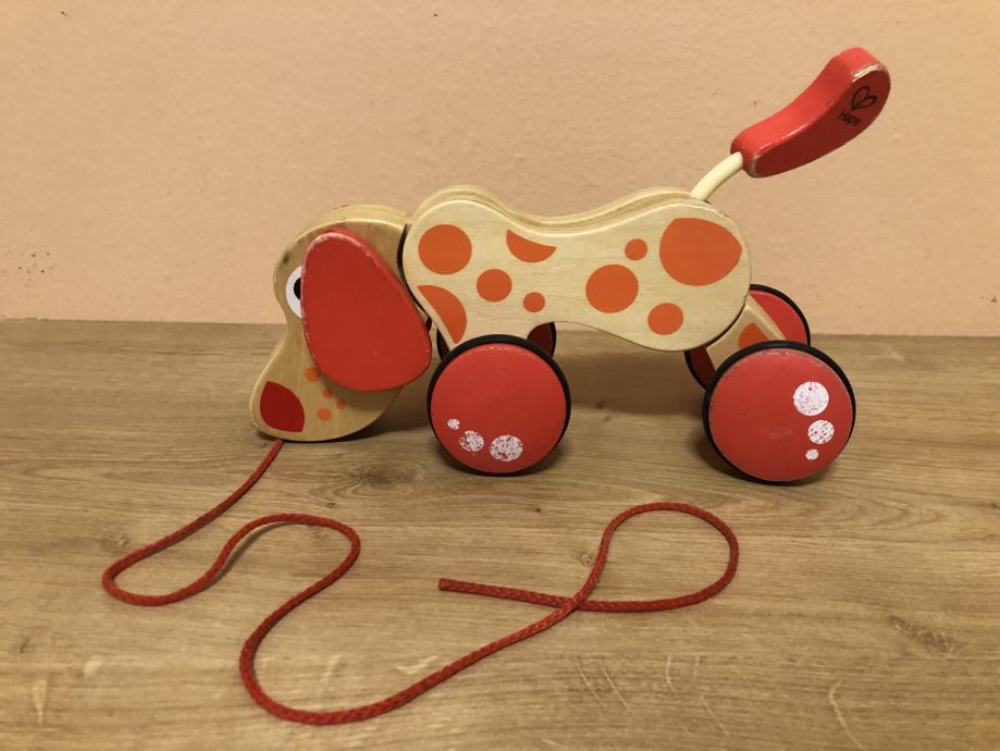 Prodam lesenega kužka na vrvici, znamke HAPE. Kuža ob premikanju maha z repkom, premika glavo in ušeska, lahko se ga tudi posede. Velikost igrače: 22 cm x 9,2 cm x 16,2 cm. Primerno za starost od 1 leta dalje.