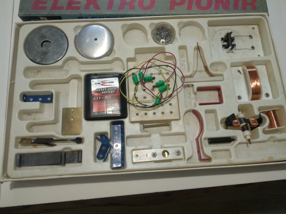 Lepo ohranjen, delno nepopoln retro komplet pripomočkov za cca 160 različnih poskusov s področja fizike, elektrike, kemije.Komplet je možno dopolniti iz drugih nepopolnih kompletov.