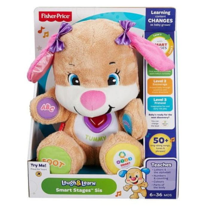 Fischer Price Laugh & Learn kužkova sestrica ima več kot 50 pesmic, melodij in fraz ter malčka uči črke in abecedo, številke in štetje, barve in dele telesa.