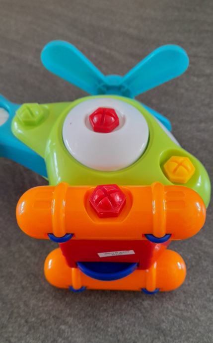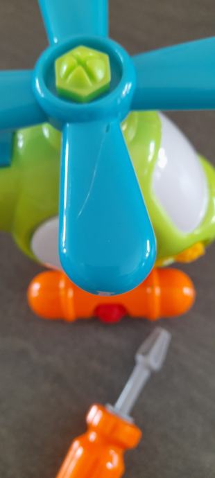 Igraca helikopter za sestavljanje in raztavljanje z vijacnikom za starost 3+, ima kolescka in pri premikanju se vrti elisa (na sliki se vidi je malo pocena). Didakticna igraca za razvoj otroka.