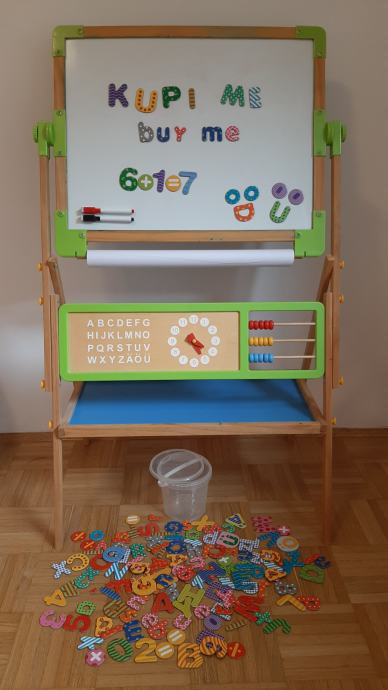 Prodam lepo ohranjeno leseno didaktično-igralno tablo. Ima rolo papirja za risanje, abakus za učenje štetja, uro s številčnico, set magnetkov za učenje abecede, številk in računanja z matematičnimi znaki. Ena stran ima belo magnetno risalno površino za ustvarjanje s flomastri, druga je primerna za pisanje s kredo.