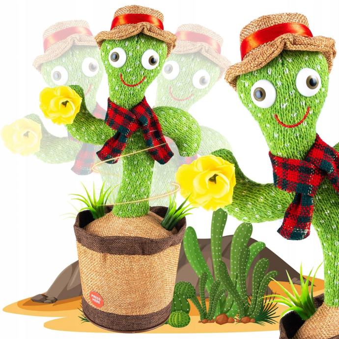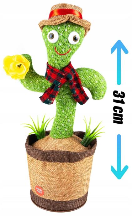 Izdelan je iz visokokakovostnih materialov, ki zagotavljajo trajnost in dolgotrajno uporabo. Deluje na baterije, kar omogoča enostavno premikanje in uporabo kjerkoli želite. Ne zamudite te priložnosti, da si priskrbite svojega interaktivnega plesočega in pojočega kaktusa ter se pripravite na neskončno zabavo in smeh.