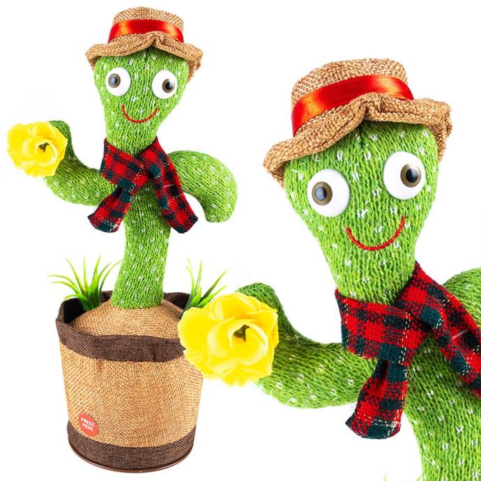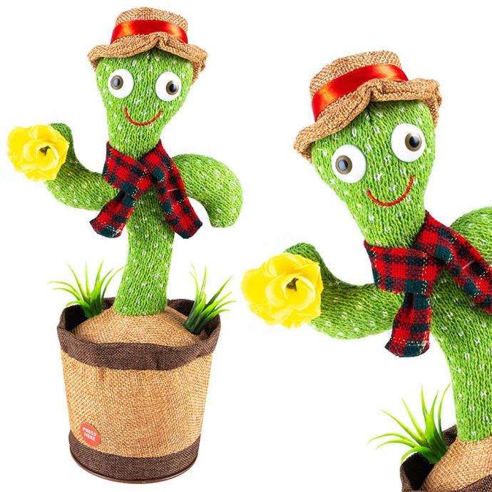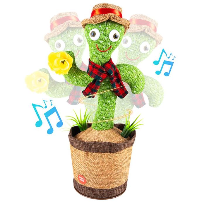 Plešoči kaktus snema in ponavlja posnete zvoke. Mehka plišasta rožica, oblečena v elegantno kapo in šal, bo zabavala vsako zabavo in razveselila vsakega otroka. Barvni svetlobni učinki naredijo zabavo privlačnejšo.