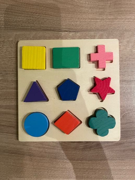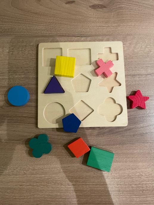 Prodam leseno didaktično igračo za prepoznavanje in vstavljanje oblik. Igrača je sestavljena iz 9 kock različnih oblik in barv ter iz lesene podloge.