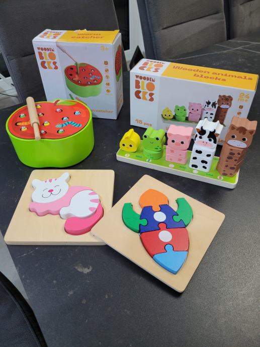 Prodam komplet štirih odlično ohranjenih lesenih igrač. Dve od teh v originalni embalaži. Igrače so primerne za razvijanje finomotorike, koordinacije, koncentracije, učenje oblik, vztrajnosti in preprosto za igro.