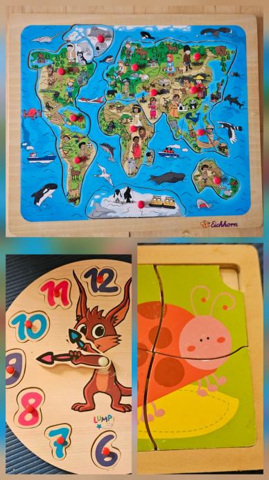 Vse sestavljanke so iz lesa, barvite, trpežne in didaktične. Lepo ohranjene, z manjšimi sledmi uporabe.