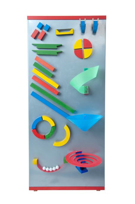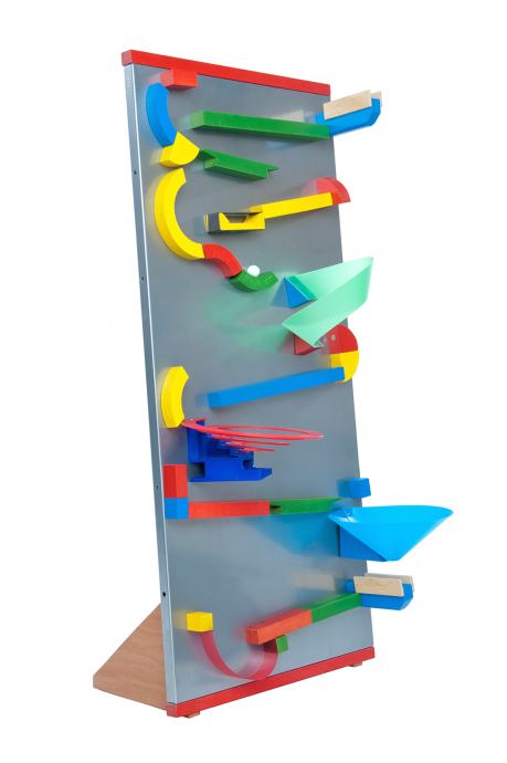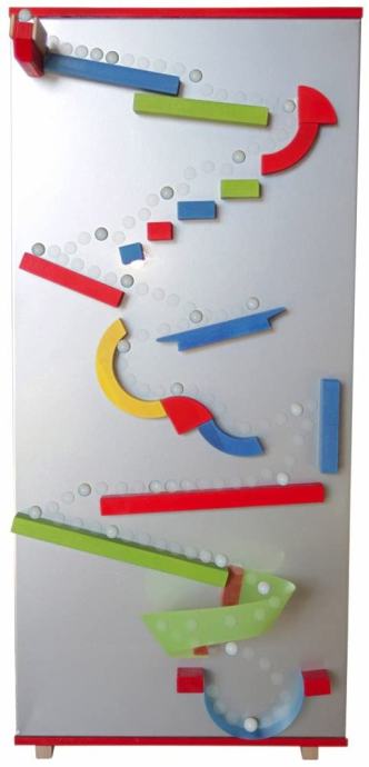 Magnetna tabla (lahko je prostostoječa ali obešena na steni ) z domiselno oblikovanimi gradniki (trampolin, lok, žleb, spirala ipd.), ki se s pomočjo magnetov oprimejo table in tvorijo dirkalno stezo za frnikule (priloženih je 5 steklenih, premera 16 mm). Možnost oblikovanja novih in novih različnih prog z vznemirljivimi kaskadnimi odseki spodbuja otroke, da eksperimentirajo in se skozi igro učijo o fizikalnih zakonitostih. Priložen tudi USB ključek z video predstavitvijo. NOVO, origalno zapakirano. Cena: 75EUR