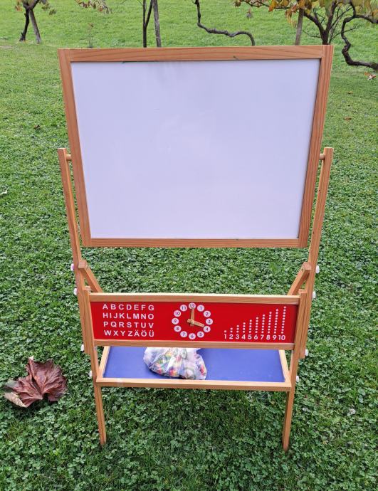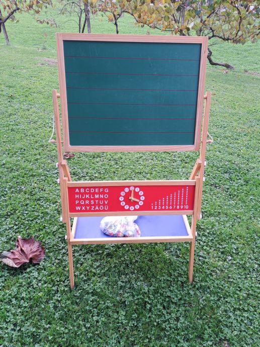 Magnetna tabla na eni strani in tabla za pisanje s kredo na drugi strani. Rabljeno.