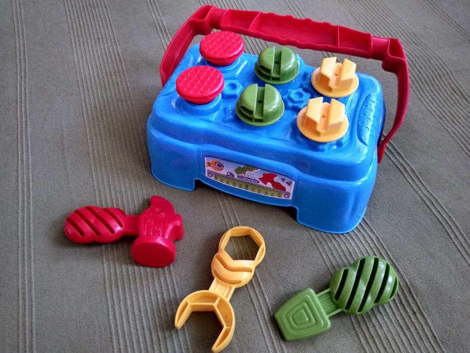 igralni set vključuje mizico s tremi orodji (kladivo, izvijač, ključ) in šestimi vijaki/žeblji; mizico se lahko uporablja kot zabojček za shranjevanje z ročajem