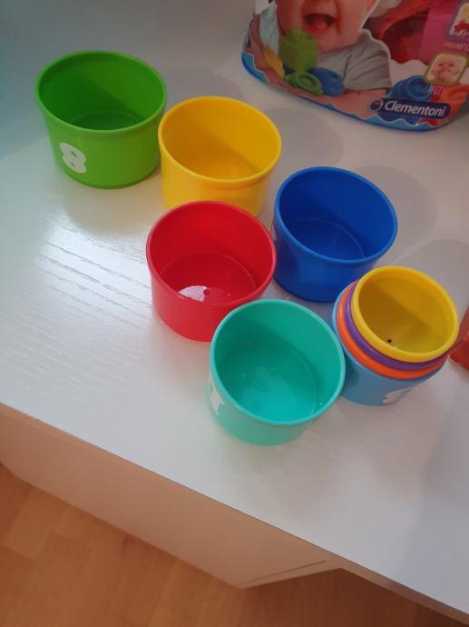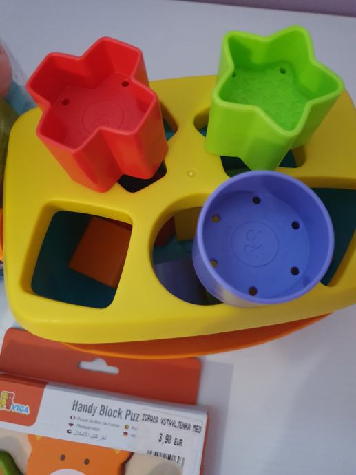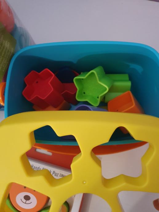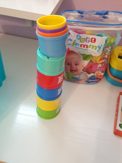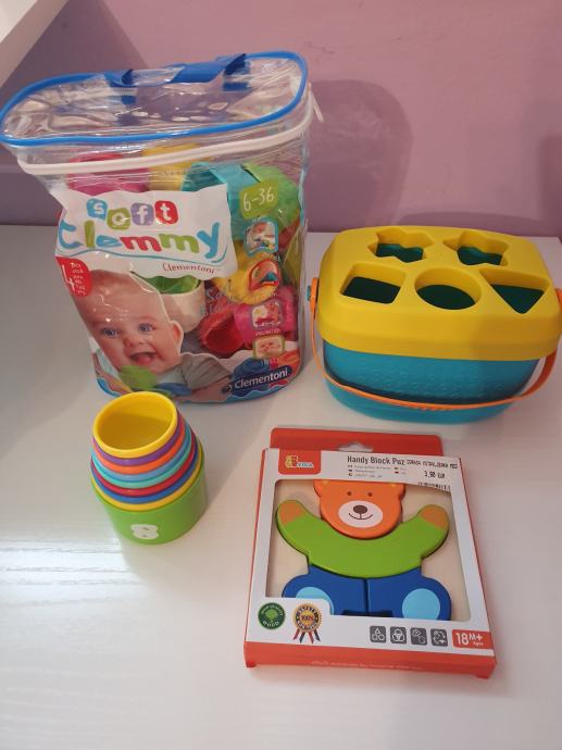Primerne so za starost otroka od 1 do 2 let. Mehke kocke, medvedek ki se zloži, lončki s številkami in črkami, zabojček z različnimi geometrijskimi liki. Igračke so skoraj nove in popolnoma čiste. >Zraven dam še kahlico, skoraj novo in previjalno blazino, primerno tudi za v avto.