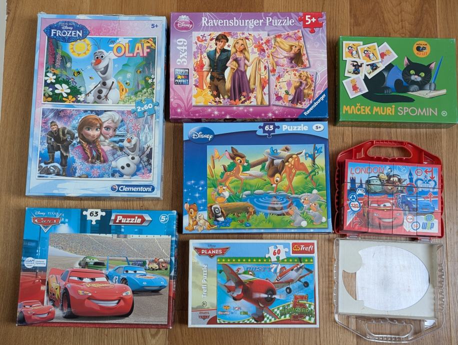 Prodam sestavljanke Ledeno kraljestvo, Zlatolaska, Bambi, Avti, Avioni in spomin Maček Muri
