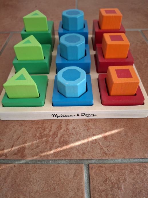Lesena igrača: razvrščanje oblik. 3 barve, 3 višine, 3 oblike.