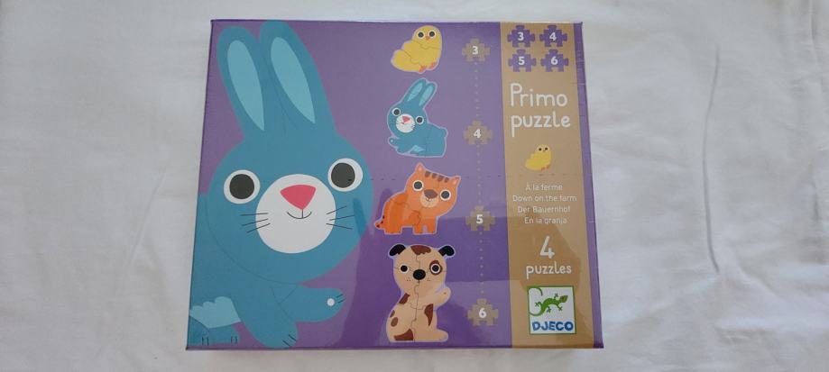Komplet vsebuje 4 sestavljanke domačih živali, namenjen starosti 2+. So kot vse Djecove stvari izjemno kvalitetne, neupogljive, nezlomljive, zato so odlično ohranjene.
