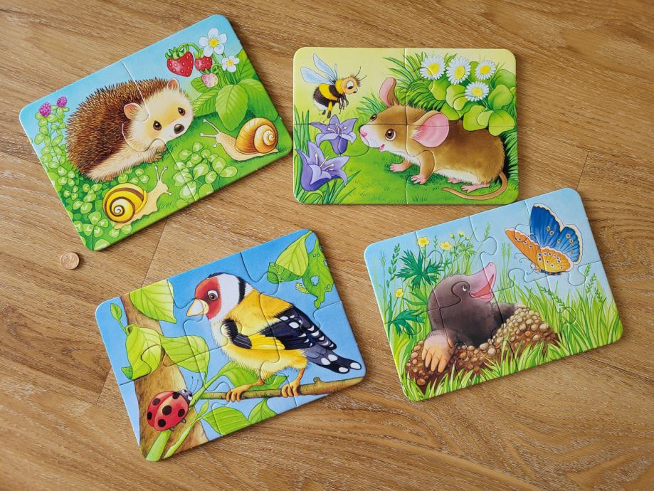Štiri sestavljanke iz trdega kartona z motivi vrtnih živalic.