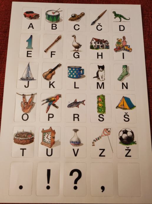 NOVA slikovna abeceda, z velikimi in malimi tiskanimi ćrkami, na A4 formati, posamezni kartončki so snemljivi.