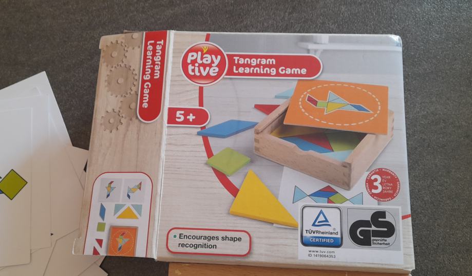 Odlicna miselna igra - sestavljanka - za otroke od 5 leta naprej. (32 lesenih ploscic s 15 karticami z nalogami, vse shranjeno v leseni škatli) Iz razlicnih geometrijskih likov se sestavljajo figure iz kartic. Zelo lepo ohranjeno- kot novo.