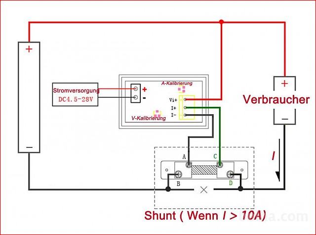 Pozor: Če je tok I >10A, morate uporabiti "Shunt" - tokovni vmesni člen (priložen v dobavi)