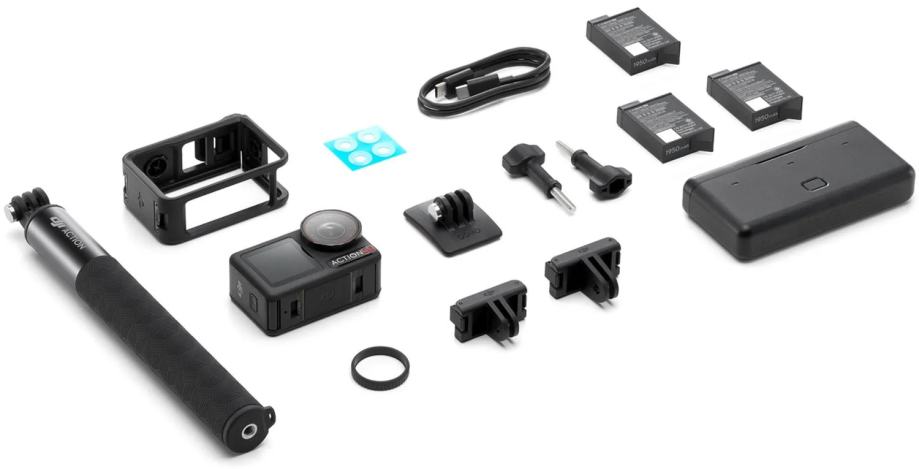 V paketu: - DJI Osmo Action 5 Pro camera - 3 x DJI Extreme Battery Plus for Osmo Action 5 (1950mAh) - DJI Multifunctional Battery Case for Osmo Action 3 & 4 - Horizontal/Vertical Protective Frame - Quick Release Adapter Mount - Quick Release Adapter Mount (Mini) - Extension Rod (59") - Curved Adhesive Base - Locking Screw - USB-C PD Charging Cable - Rubber Lens Protector - DJI Glass Lens Cover for Osmo Action 5 Pro - Anti-Slip Pad - Logo Sticker