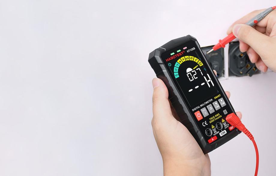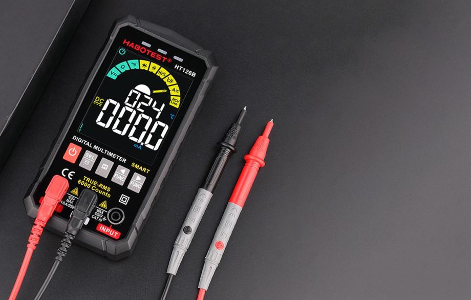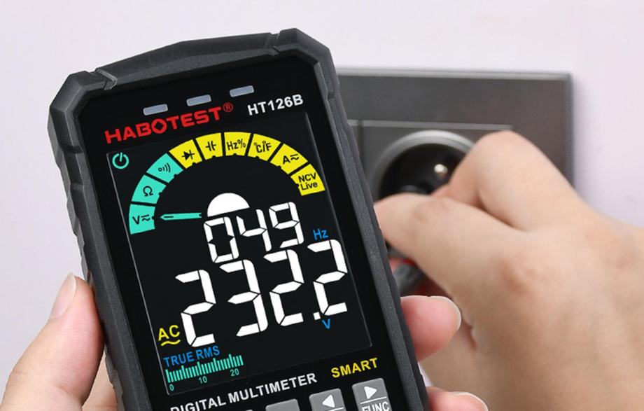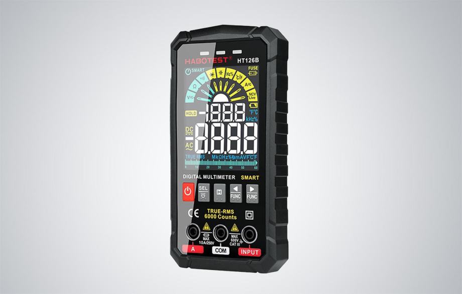 HT126B je pameten in robusten multimeter podjetja Habotest. Ker se odlikuje po natančnih meritvah, ga lahko uporabljate tudi na prostem. Opremljen z velikim barvnim zaslonom in silikonskimi gumbi – uporaba je preprosta in udobna. Kompakten in lahek – ima tudi LED svetilko, ki omogoča delo tudi v temnih prostorih. Za delovanje potrebuje 4 AAA 1,5 V baterije (niso priložene). Uporabite ga lahko za merjenje napetosti, upora, kapacitivnosti itd.