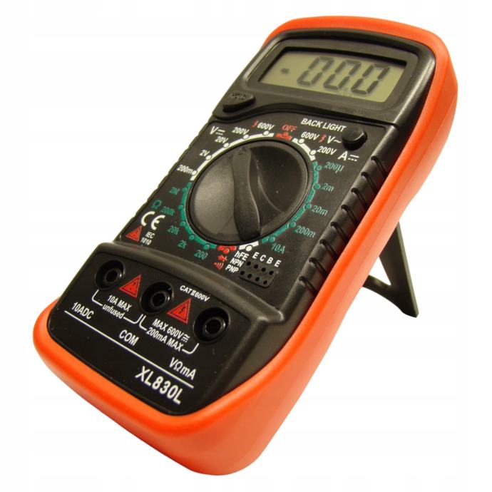 SPECIFIKACIJA – merjenje izmenične napetosti v območju: 200V – 600V; Merjenje enosmerne napetosti v območju: 200mV – 600V; Merjenje enosmernega toka v območju: 200µA – 10A; merjenje upora v območju: 200?~2M?; merjenje ojačanja hFE tranzistorjev; preizkus diode; indikator nizke baterije merilnika; največji odčitek 1999; signalizacija polarnosti med meritvami enosmernega toka in napetosti; signalizacija prekoračitve merilnega območja; napajanje: baterija; dimenzije: 14x7x3,5 cm; teža: 0,125 kg; teža v paketu: 0,237 kg.