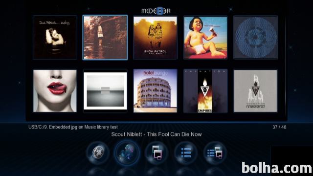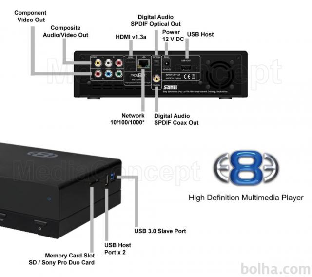 Predvajanje multimedijskih datotek je omogočeno preko internega diska, omrežnega diska (SAMBA ali Windows share), USB naprave ali SD kartice.
