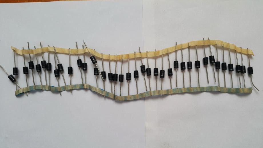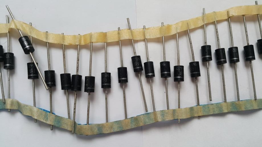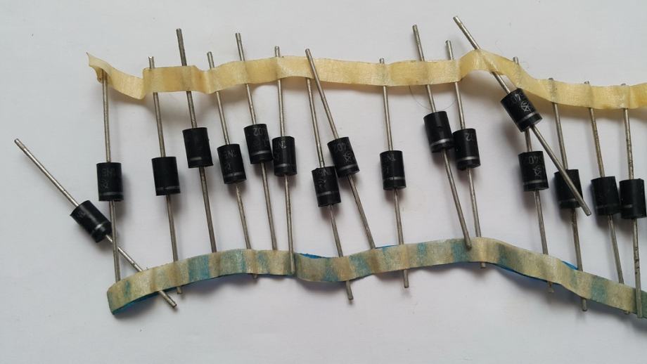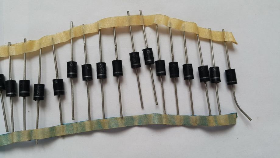 Prodam več kosov (37) precej starejših originalnih Iskrinih 1N5402 diod. Vse so stare sigurno 20 let in se mi kot realno nove, nerabljene valjajo že nekaj časa v predalu v delavnici. Začuda imajo še vse v bistvu popolnoma ohranjene vrednosti/parametre (testirane na multimetru pač). Zadeva ima praktično torej že zgodovinsko vrednost (poleg funkcionalne).