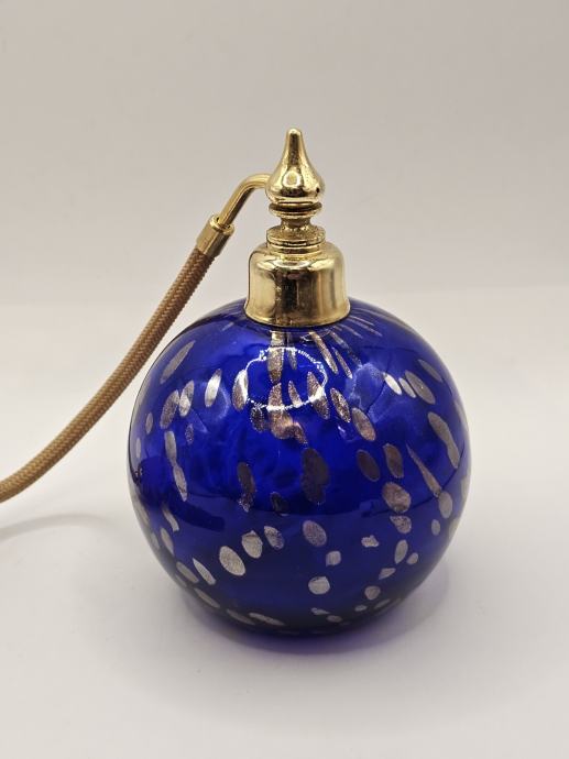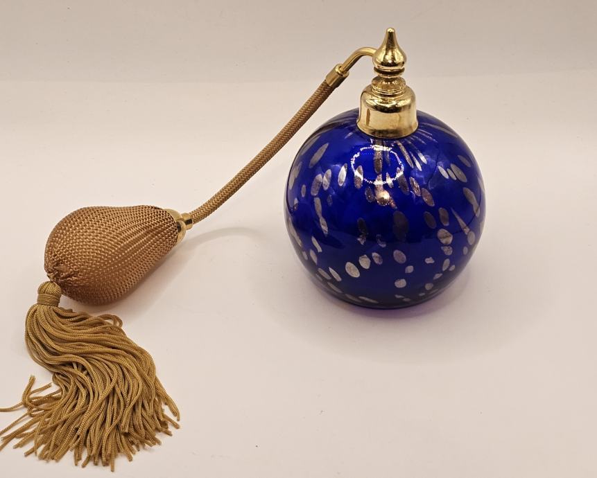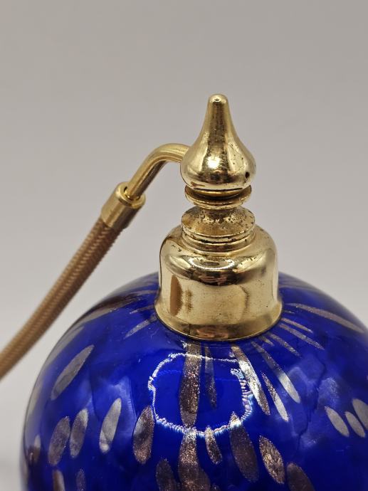 Vintage parfumna steklenička iz kobaltno modrega stekla z ročno poslikanim vzorcem. Višina približno 12 cm. Ohranjen kos z razpršilko.