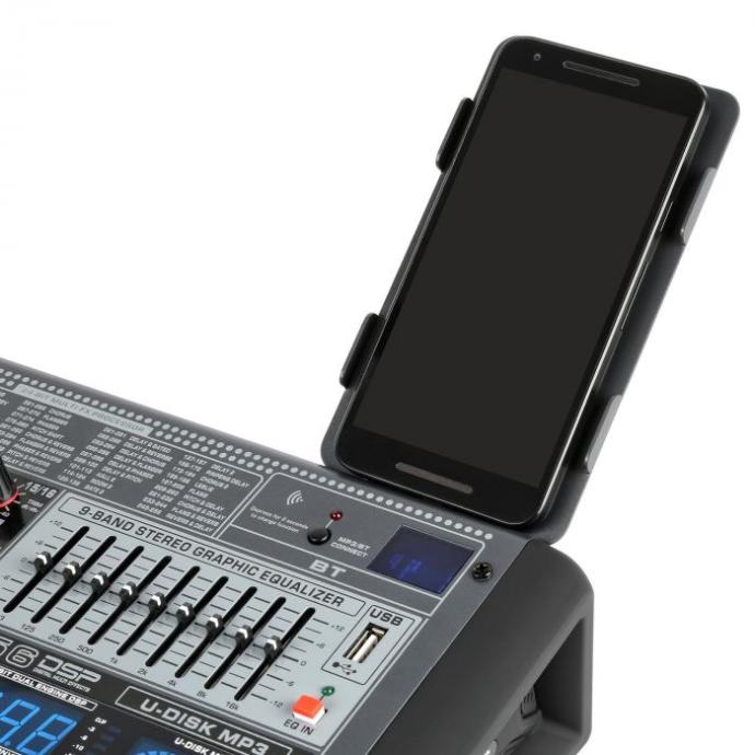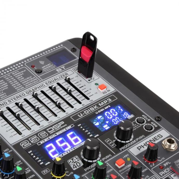 * priključki: 1 x USB vhod, 10 x XLR vhod za mikrofon, 4 x 6,3mm jack linijski vhod, 8 x 6,3 mm jack insert vhod, 1 x stereo cinch linijski vhod, 1 x 6,3mm jack AUX send-return vhod, 1 x 6,3 mm jack izhod za slušalke, 1 x stereo cinch linijski izhod, 1 x XLR main izhod, 1 x 6,3 mm jack main izhod, 1 x ločevalni control room izhod * multi-FX procesor s 256 prednastavitvami * vgrajen MP3 predvajalnik z digitalnim zaslonom * bluetooth vmesnik za pretok zvoka * DSP: 24-nitni multi-FX procesor * 9-pasovni izenačevalnik * +48 V phantom napajanje * 75 Hz low cut filter kanál 1 - 8 * master regulator glasnosti * regulator glasnosti slušalk * ločeno stikalo za vsak kanal * stikalo za vklop/izklop za vsak kanal * visoke, sredinske in nizke tone lahko nastavite za vsak kanal * nastavljiv FX, pan in trim glasnost za vsak kanal * AUX regulator * regulator učinkov * FX regulator * gain regulator * pan regulator * LED VU meter * peak LED-kontrolna lučka * LED-kontrolna lučka za učinek * frekvenčni razpon: 10 Hz - 45 kHz (+/-3 dB) * SNR: 112 dB * popačenje: < 0.01 % * output level: +/- 1 V * input line: +/- 150mV * vhod: mikro: +/- 1,5mV * napajanje: 100 - 240 VAC, 50/60 Hz
