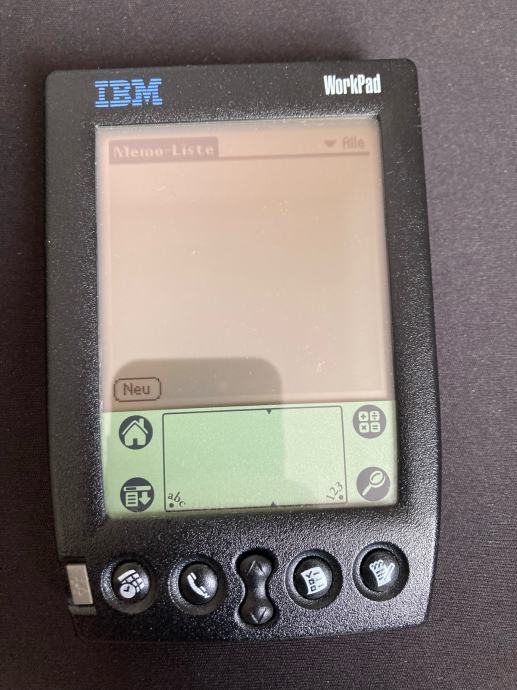 Delujoč dlančnik IBM WorkPad v usnjenem ovitku. Manjka polnilec in pisalo.