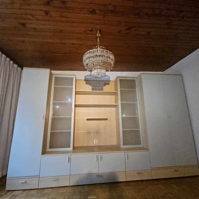 Več spodnjih predalov in omaric.Skupno veliko shranjevalnega prostora