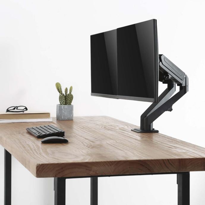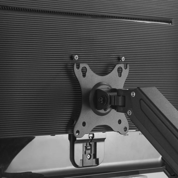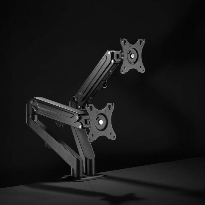 Nosilci monitorjev so opremljeni s plinsko tlačno vzmetjo, tako da jih je mogoče gladko in tiho premikati. Medtem ko je treba običajne nosilce na nosilni roki prilagoditi, pri tem modelu zadošča rahel poteg ali pritisk na rob zaslona. Tako je individualna nastavitev višine, naklona in vrtenja še udobnejša. Za zagotovitev, da monitorji varno sedijo na nosilcih, imajo standard VESA 100 x 100 mm in 75 x 75 mm.