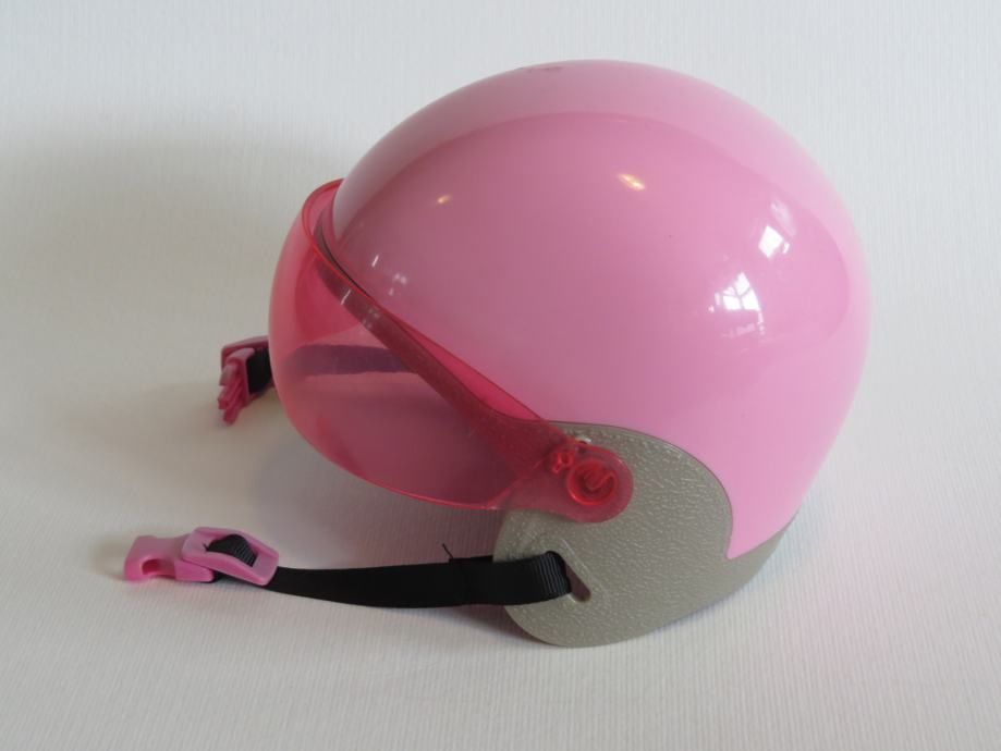 Čelada je roza barve, dobro ohranjena in se lahko pripne na igračo s pomočjo pasov.