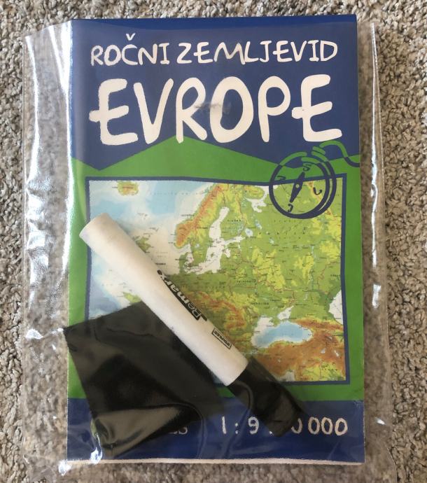 Zraven plastificiranega zemljevida sta priložena flomaster in krpica za brisanje.