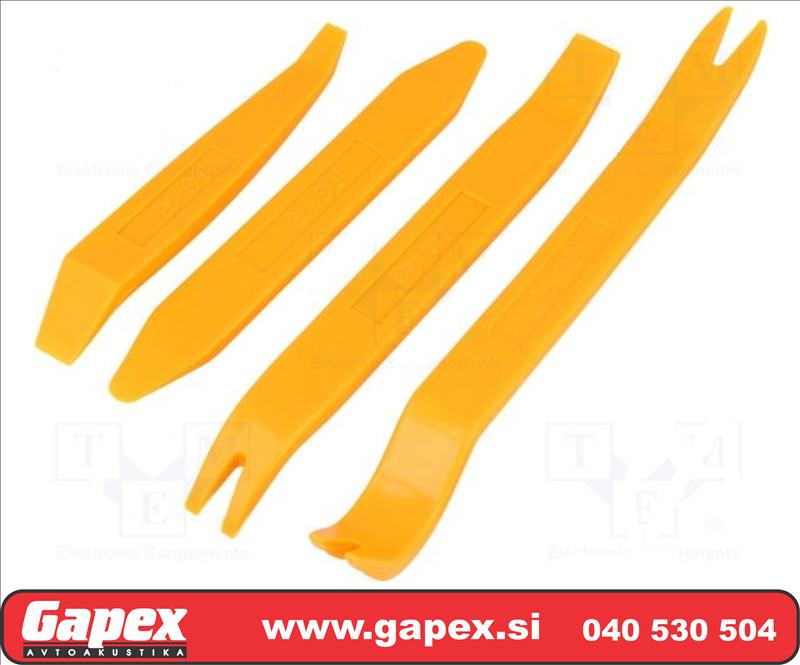 Set demontažnih vilic za odstranitev avtoradia. V kompletu se nahaja par vilic, ki omogočajo varno odstranitev avtoradia brez poškodb armaturne plošče.