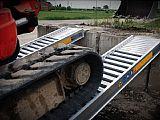 Nakladalne aluminijaste rampe z robustno konstrukcijo za naklad delovnih strojev s kovinskimi gosenicami. Specifikacije modela 120.00.003 standardni priklop: