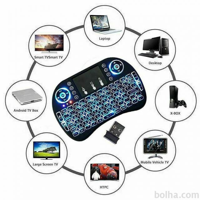 Mini brezžična tipkovnica se s svojo obliko lepo prilagaja roki in omogoča tudi upravljanje z eno samo roko. Naprava združuje QWERTY brezžično mini tipkovnico in sledilno ploščico TouchPad, ki ju z računalnikom, televizijo povežemo preko brezžičnega vmesnika USB. Računalnik mini tipkovnico prepozna samodejno, tako da nameščanje dodatnih gonilnikov ni potrebno. Naprava je idealna za predavatelje, vodje prodaje, predstavitelje in za vse domače uporabnike, saj omogoča brezžično uporabo v polmeru 10-ih metrov, kar vam bo olajšalo brskanje in uporabo vaših pametnih naprav (Smart TV-ji, računalniki, projktorji, itd…). Ta brezžični komplet pa je mogoče uporabiti tudi z napravo Android TV Box. Izdelek se ponaša tudi z inovativno funkcijo, kjer s pritiskom na tipko Fn in uporabo drsne plošče nadomestimo funkcijo koleščka miške. Za mnoge ljudi je to bolj priročna metoda za brskanje po spletnih straneh in urejanje dokumentov.