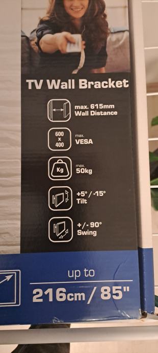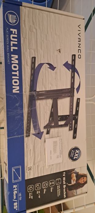 Nov, nerabljen stenski TV nosilec Vivanco BFMO6560 180ST FULL MOTION, ki omogoča prilagodljivo namestitev televizorja. Nosilec podpira TV velikosti do 216cm/ 85 inčev in ima možnost nagiba ter vrtenja za optimalno gledanje. Nosilnost do 50kg