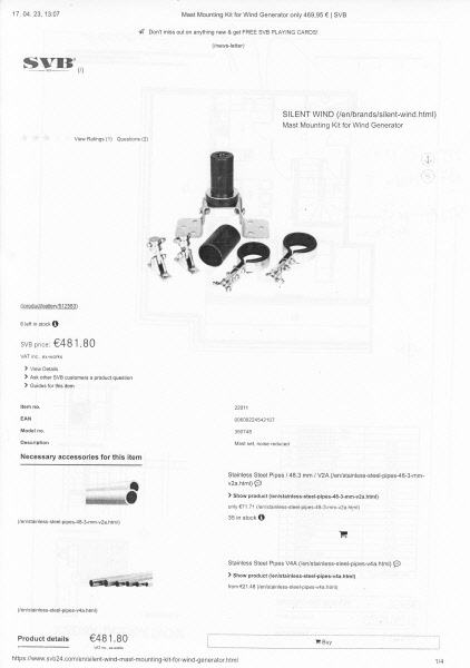 Stojalo za vetrni generator za montažo na jadrnico, vikend ali kamorkoli z vsemi nosilci, vijaki in gumi vpetji ter originalnimi ALU cevmi, višine 270 cm, s premerom glavne cevi 48 mm prodam za 250,00 €. https://www.svb24.com/en/silent-wind-mast-mounting-kit-for-wind-generator.html Info 031 323809.